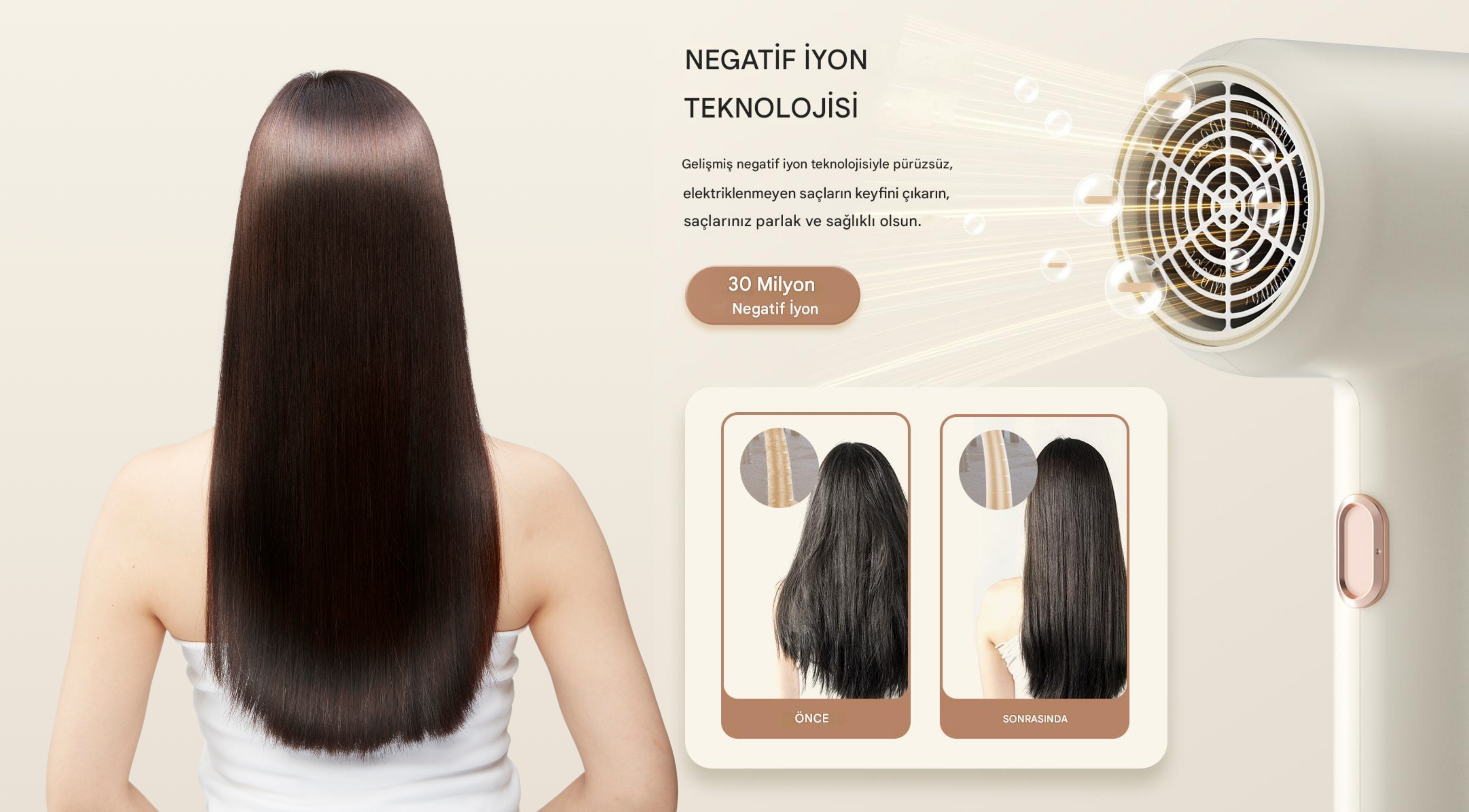 Saç koruması için isteğe bağlı negatif iyon teknolojisi